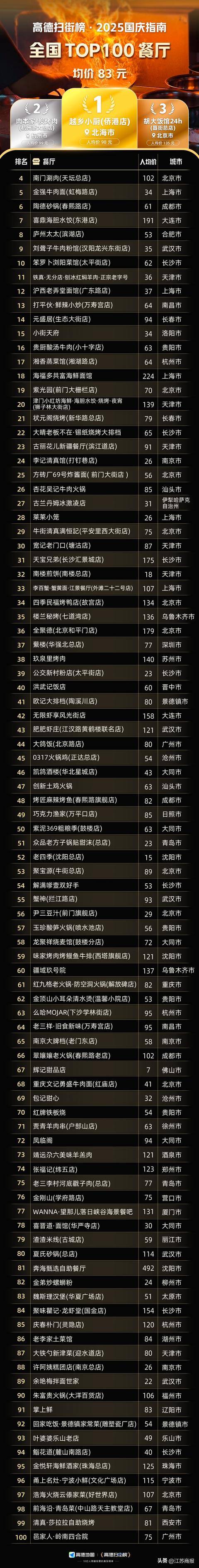 9月29日,高德扫街榜发布《国庆指南:全国TOP100餐厅》。作为国内首个全国性餐厅TOP100榜单,它已成为今年国庆长假最受关注的美食指南。